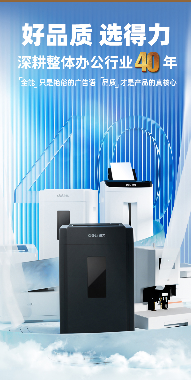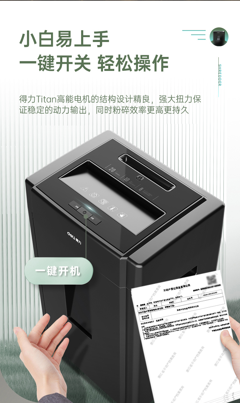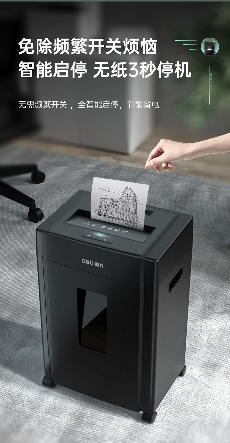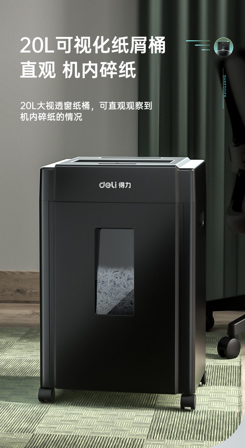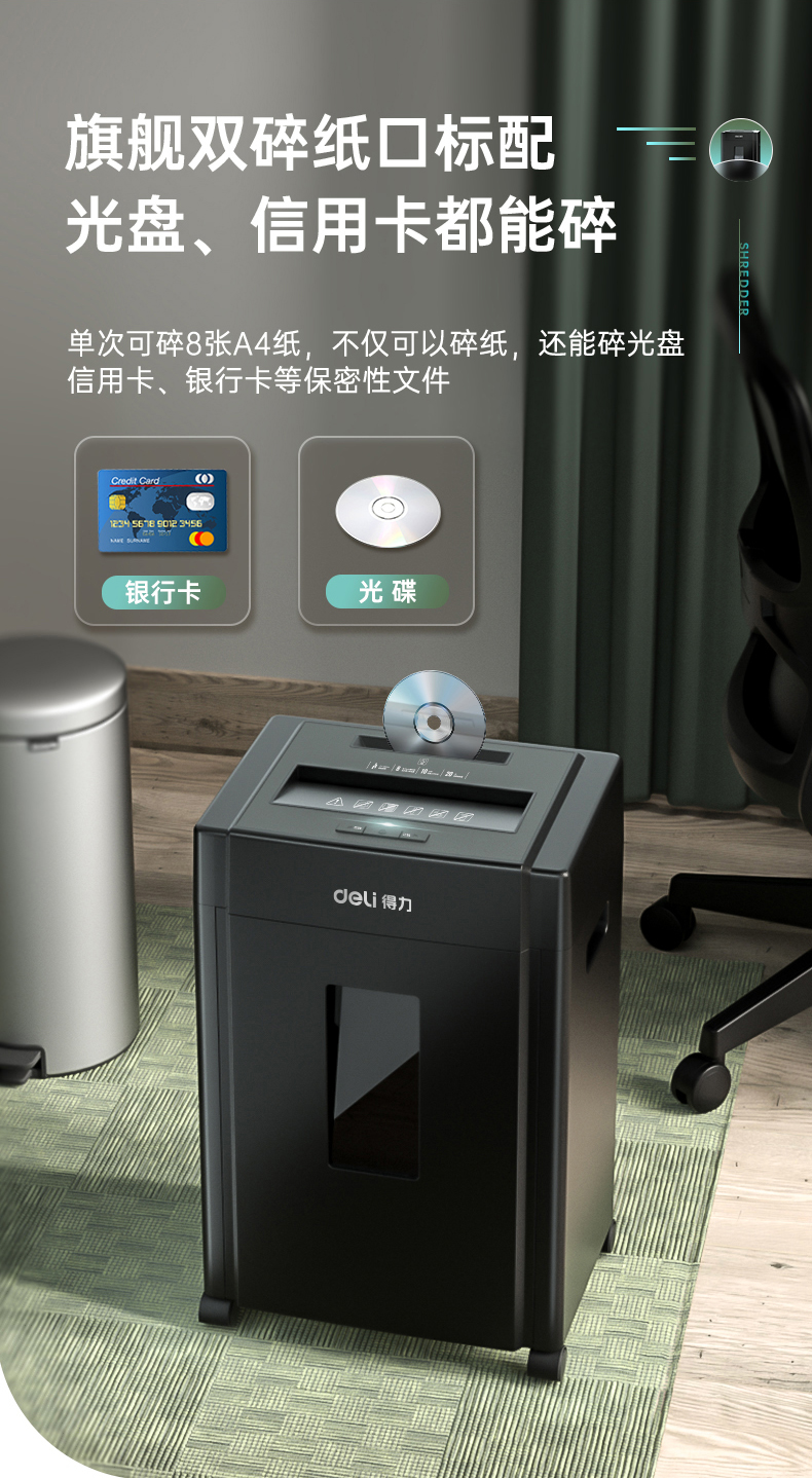 得力 deli 5級(jí)保密辦公商用碎紙機(jī)(單次8張 20L 持續(xù)10分鐘 可碎卡碎光盤)33043